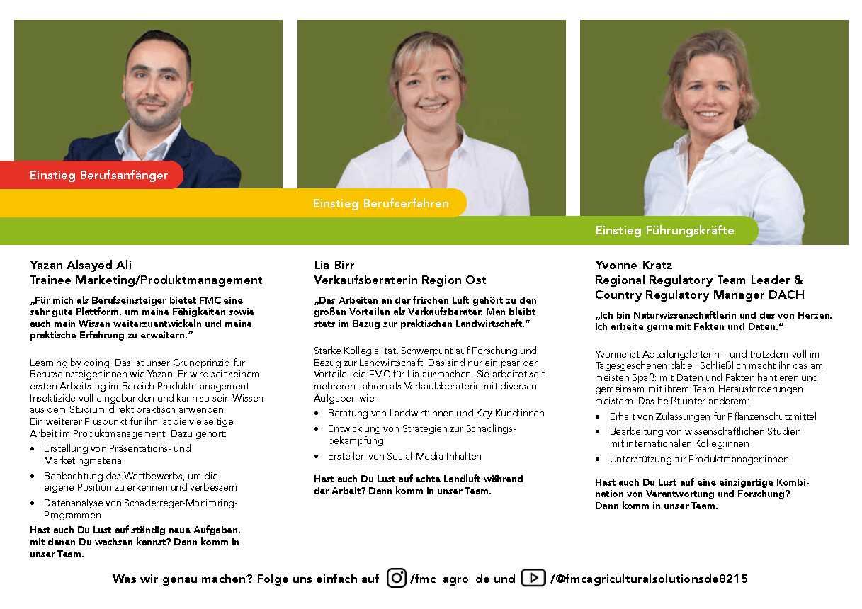 Wir, FMC Agricultural Solutions, bieten innovative Pflanzenschutzlösungen für Erzeuger auf der ganzen Welt an. Dabei zählen wir dank des Engagements unserer rund 6.500 Mitarbeiter:innen weltweit zu den fünf größten Herstellern.