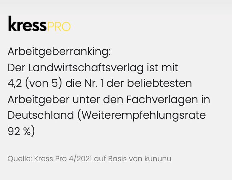 Auch in Zukunft werden wir daran arbeiten, publizistisch und wirtschaftlich Marktführer bei den Agrarmedien zu bleiben. Sie sind eingeladen, aktiv an unserer Erfolgsgeschichte mitzuwirken. Für uns sind die Mitarbeiterinnen und Mitarbeiter ein ganz zentraler Erfolgsgarant. Wir versuchen individuell auf die Wünsche und Bedarfe einzugehen und stellen dazu ein breites Portfolio an Leistungen zur Verfügung. Wir bieten Ihnen interessante, praxisorientierte Aufgaben und gute Entwicklungsmöglichkeiten. Interne und externe Weiterbildungsmaßnahmen, betriebliche Altersvorsorge, Gesundheitsförderung, Familienservice und ein Jobticket runden unser Angebot ab. Besuchen Sie uns unter www.lv.de/karriere und informieren Sie sich über die Einstiegsmöglichkeiten.