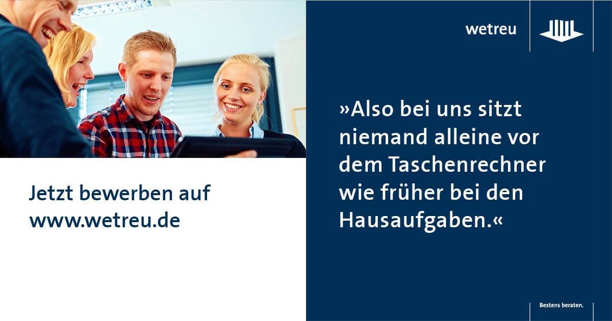 Dann interessiert uns nicht nur Ihr Können, sondern auch Ihre Persönlichkeit. Gleich ob Erstausbildung, Studienabsolvent oder Professional, es gibt viele Wege für eine wetreu Karriere. Denn neben einem offenen und produktiven Arbeitsklima bieten wir Ihnen zahlreiche Möglichkeiten zur umfassenden Aus- und Weiterbildung, um sich in der Ausübung der Tätigkeit zu verbessern, das Wissen zu erweitern oder sich auf spannende Aufgaben im wetreu Konzern vorzubereiten.