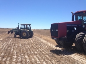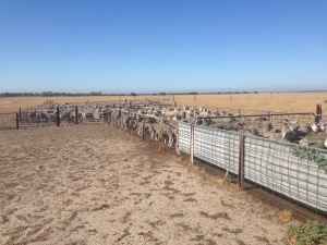 Die Schafe stehen auf den abgeernteten Äckern um die Farm herum und fressen neben der Mischration vorallem Ausfallgetreide und die Stoppeln. Hinzu kommen täglich 2 Futtermischwagen á 4 Tonnen für die Rinder im Feedlot.