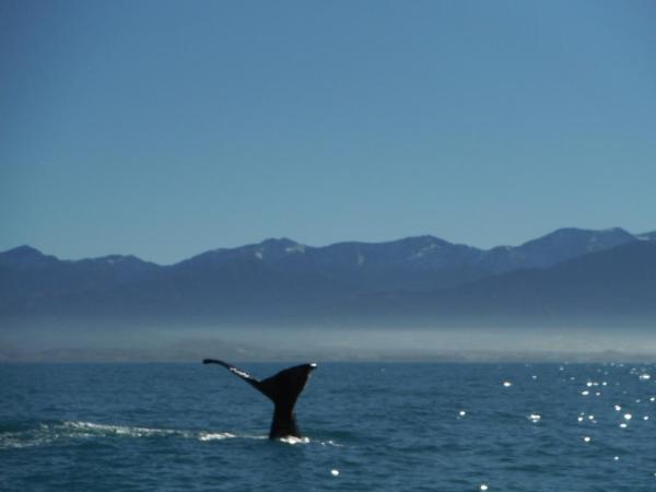 Los ging es dann also am Sonntag, dem 7. Mai. Unser erstes Ziel war Kaikoura. Für den nächsten Morgen hatten wir schon bei der Walbeobachtungsstation eine Tour gebucht. Mit 40 weiteren Passagieren fuhren wir mit einem Boot hinaus aufs Meer. Nach etwa 20 Minuten konnte der erste Pottwal ausfindig gemacht werden. Mit dem bloßen Auge ist dieser von weitem nur anhand der Wasserfontänen erkennbar. Um aber erst einmal herauszufinden, in welche Richtung das Boot fahren muss, wird ein Mikrofon unter Wasser gehalten und den Klängen des Wals gelauscht. Da ich zufällig neben dem Kapitän stand, als er die Wale suchte, hat er mir angeboten, auch einmal die Kopfhörer aufzusetzen und dem riesigen Wal zuzuhören. Überraschenderweise war der Laut ein sehr gleichmäßiges Klicken, mit dem der Wal seine Beute anlockt. Dieses ist auch das einzige Geräusch, mit dem das Tier geortet werden kann, und anhand der Lautstärke kann seine Position auf hunderte Meter genau festgestellt werden. In den 2 Stunden auf dem Wasser sahen wir zwei dieser Meeresräuber. Der Erste war etwas träge, beim Zweiten kam während des Abtauchens die riesige Flosse zum Vorschein.
