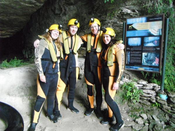 Einige Kilometer weiter hielten wir an der längsten Hängebrücke Neuseelands, bevor es dann weiter nach Westport ging. Von dort aus fuhren wir am nächsten Morgen nach Charleston, wo eine Underworld-Rafting Tour startete. Ein privates Unternehmen bietet diese Führung durch eine Höhle und das anschließende „Tubing“ (eine Wildwasserfahrt auf einem Gummiring) an. In einer angenehmen Gruppe von 5 Personen fuhren wir mit einer kleinen Bimmelbahn durch den Regenwald. Am „Bahnhof“ angekommen mussten wir zuerst unsere Neoprenanzüge anziehen. Nach anschließenden 15 Minuten Fußmarsch kamen wir am Höhleneingang an, die sich an den Helmen befindenden Lampen wurden eingeschaltet und die Tour durch die Unterwelt begann. Vorbei an unzähligen Tropfsteingebilden (Stalagmiten und Stalaktiten), die viele zigtausende Jahre alt waren, kamen wir irgendwann zu einem Ort, an dem wir anhalten sollten und die Lichter ausschalten mussten. In diesem Höhlenbereich war es zu 100% dunkel, das heißt, dass man die Hand vor Augen nicht mehr erkennen konnte.