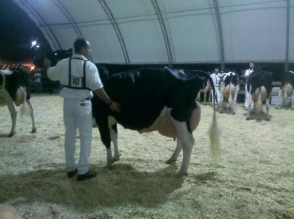 Die Show konnte ohne weitere Zwischenfälle um 18:30 Uhr beginnen. Es ging los mit der März-Klasse. Wir starteten sofort mit unserem „besten Pferd im Stall“. Unser Baby-Kalb (die Kälber der März-Klasse werden hier tatsächlich Babys genannt) ist Winterbay Goldwyn LORA. Dieses milchtypische und für ihr Alter enorm stark entwickelte Kalb ist die Vollschwester von Winterbay Goldwyn LOTTO, Grand Champion der Royal. Die Royal ist die zweitgrößte Schau der Welt (nach der World Dairy Expo in Madison) und findet jedes Jahr im November in Toronto statt. LORA wurde erst vor 2 Wochen von Steve und Mike (Velbros Farms Ltd.) gekauft. Im Ring lieferte sie sich ein Kopf an Kopf- Rennen mit einer sehr guten Fever-Tochter und konnte sich am Ende gegen 19 andere Kälber durchsetzen! Ein wahnsinns Erfolg für die beiden Besitzer!