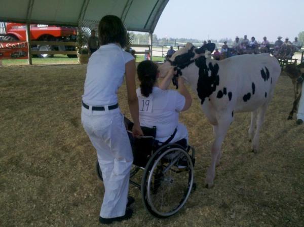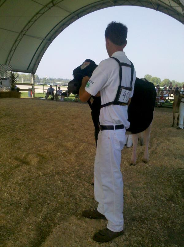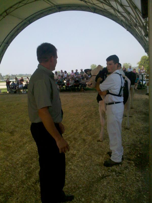 Am Freitagmittag kam es dann zum Endspurt: Der 4-H Wettbewerb stand auf dem Plan. Im Gegensatz zu den Wettbewerben in Deutschland starteten sie mit den ältesten Vorführern. Das ist auch für die meisten Jungzüchter hier neu und zum Teil noch gewöhnungsbedürftig. Es soll aber dazu dienen, den jüngeren Kindern zu zeigen, wie sie ihr Kalb vorführen sollen. Die Vorführweise unterscheidet sich kaum zu der in der Heimat. Ich habe nur 2 Unterschiede feststellen können: Zum Einen wird beim Einziehen in den Ring so lange vorwärts geführt, bis der Letzte mit seinem Rind im Ring ist. Desweiteren unterscheidet sich die Positionierung beim Aufstellen zum Preisrichter etwas. Die Hinterbeine stehen einen Schritt auseinander, wie zuhause, die Vorderbeine hingegen stehen parallel und nicht um eine Klauenlänge versetzt. Außerdem werden hier die Gruppen anders eingeteilt.