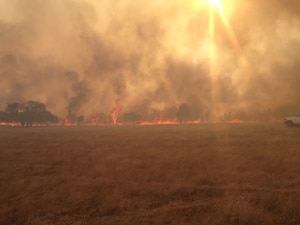 Von weitem konnte man schon erkennen, dass dieses Feuer sich auf eine größere Fläche ausbreitete als die letzten. Da sich das Feuer schnell ausbreitete und den nahe gelegenen Scherschuppen der Farm bedrohte wurde der Grader aus Watheroo angefordert.