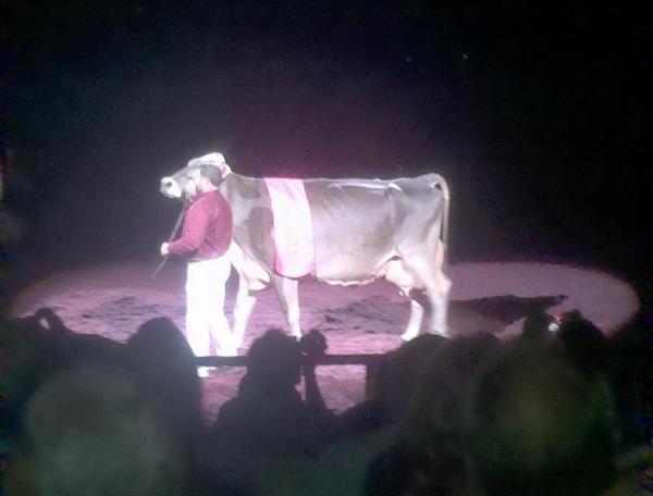 Zurück zu den Ställen der Expo, denn dort kamen wir genau zum richtigen Zeitpunkt an: Kurz nachdem wir an Hezbollah vorbei liefen, hieß es für sie „Tail-Time“. Sie hat also doch einen kleinen Schönheitsfehler, welcher im Ring jedoch keinem mehr auffallen sollte: Der Schwanz dieser Berühmtheit endet etwa in Höhe vom Beginn des Hintereuters. Die Kuh wurde dann, begleitet von 4 Betreuern, raus aus dem Stall und in die Dunkelheit gebracht, um ihr Aussehen perfekt zu machen.