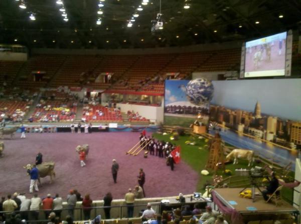 Das Beste an diesem Bereich war für mich, dass ich dort auch einige Gesichter aus Deutschland wiedererkannte und die Gäste aus aller Welt bestens mit kostenlosen Snacks, Kaffee und Kaltgetränken versorgt wurden! Bevor wir zum Mittagessen gingen, schauten wir der internationalen Brown-Swiss-Show zu. Die Arena war atemberaubend. Ich wusste zwar aus Erzählungen, dass sie groß sei, aber das übertraf meine Vorstellungen vollkommen! Der Ring war in diesem Jahr mit lila-gefärbten Sägespänen gebettet, was die ganze Atmosphäre in Kombination mit den Stellwänden und den schwarzen Vorhängen einfach perfekt machte und der Show ihren würdigen Rahmen gab.