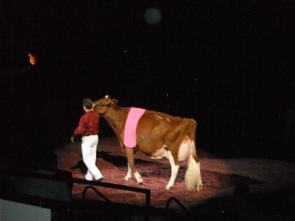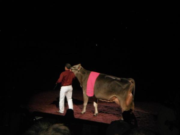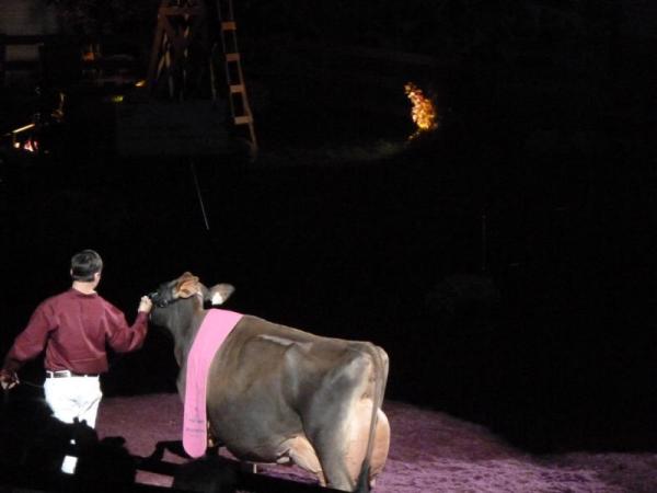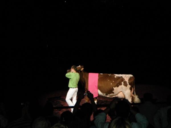 Nach und nach schritten die Grand Champions aller Rassen in den Ring. Während jede Kuh einzeln einlief, wurden ihre schon erreichten Titel vorgetragen. Das machte die Atmosphäre sehr feierlich und einfach wunderschön. Die Vorführer hatten, passend zu den Sägespänen, lila-farbene Hemden an. Auch die Kühe blieben dieser Farbe mit einer Decke treu. Es lief leise Musik im Hintergrund, ansonsten war es vollkommen still. Der Umschlag mit dem Namen des Supreme- Champions wurde, wieder im Spotlight, von einer Frau zum Redner-Pult gebracht und dann verkündet: Supreme-Champion ist Missy, die Holstein-Kuh, Reserve Supreme-Champion war der Grand-Champion der Jerseys. Nach der Stille folgte natürlich tosender Applaus, was alles noch perfekter machte.