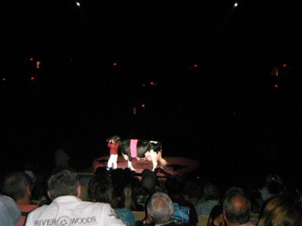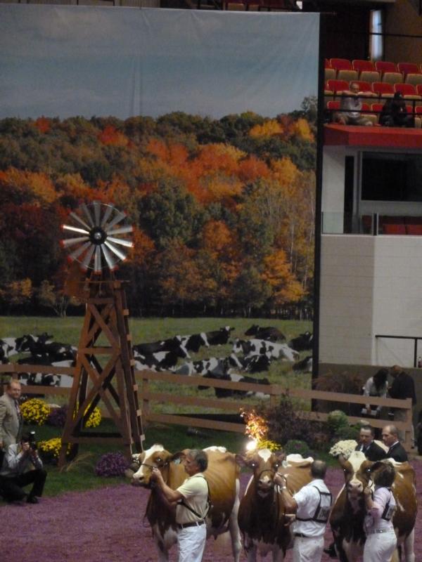 Und dann war die Abreise geplant, was mich wirklich traurig machte. Wenn ich schon mal bei der World Dairy Expo war, wollte ich doch gerne noch den Supreme-Champion sehen. Denn gerade dieses Ereignis sollte der Höhepunkt nach den ganzen Tagen sein! Jenny schien jedoch nicht wirklich daran interessiert zu sein, und auch Jennifer wollte gerne ins Auto um möglichst zügig die Rückreise nach Kanada zu beginnen. Nach etwa einer halben Stunde gutem Zusprechen von einigen anderen Freunden wurden die Beiden dann doch umgestimmt, um mir die Wahl zum Supreme nicht vorzuenthalten. Und das hat sich wirklich gelohnt!! Die Arena wurde komplett abgedunkelt. Dann wurden sowohl die amerikanische als auch die kanadische Nationalhymne gesungen. Nach einigen Reden standen dann die Kühe wieder im Rampenlicht.